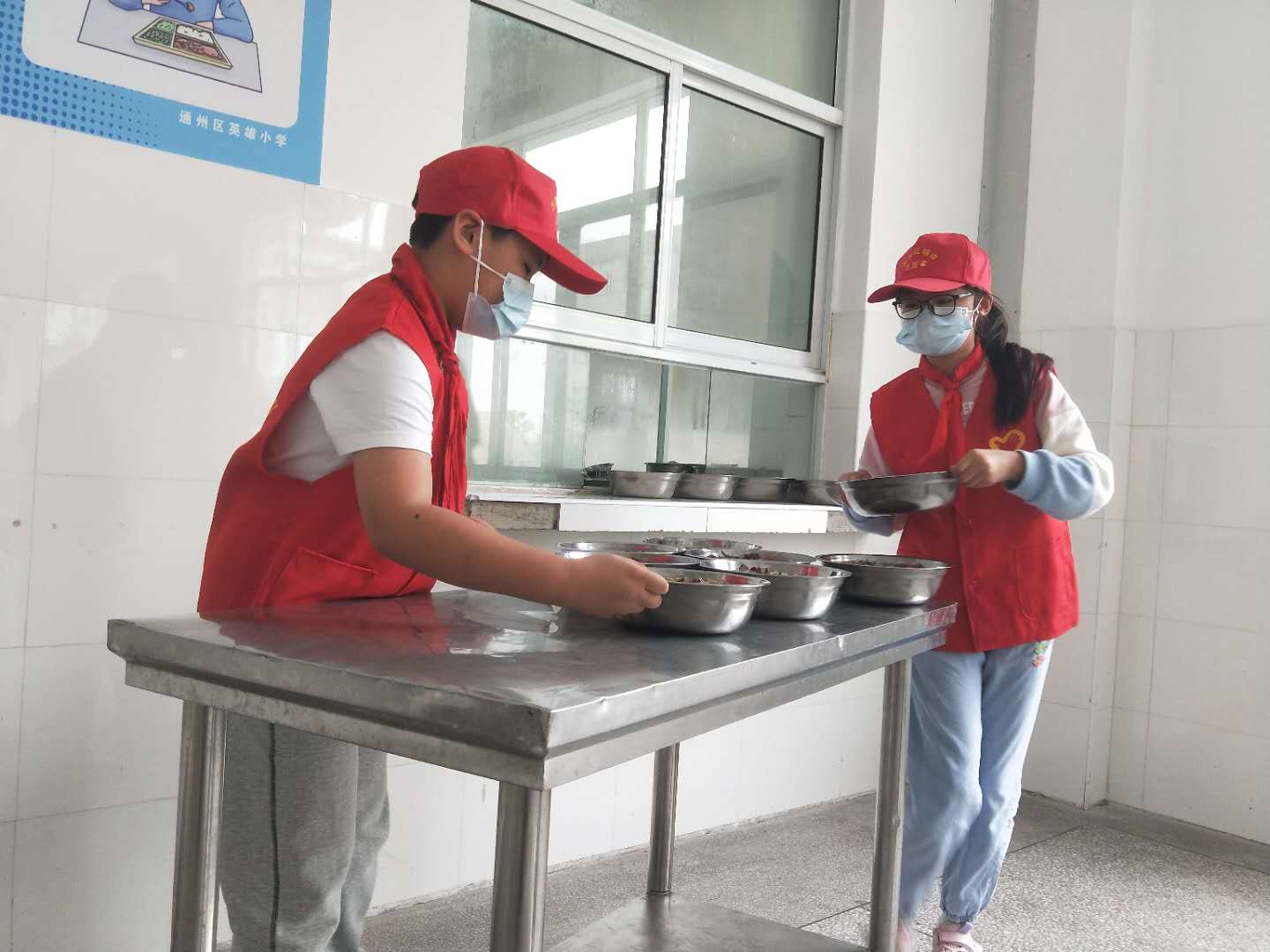 为了提高学生的动手能力,树立志愿服务意识,9月22日上午,通州区英雄小学开展了“小红帽”走进食堂帮厨志愿服务活动。