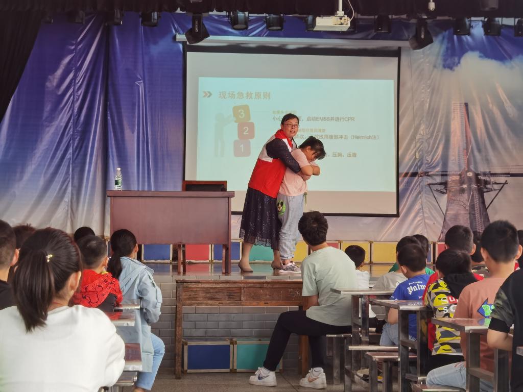 最后,老师演示了当气管被异物卡住时急救的方法,邀请学生上台模拟,通过非常详细地演示讲解,同学们学到了急救的两种措施。一是拍打肩胛骨中间,拍打五次;二是腹部冲击急救。