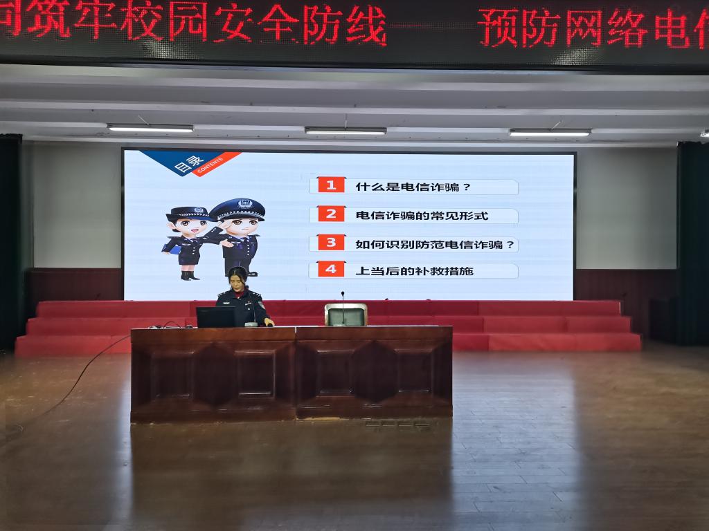 近年来,随着社会信息化的快速发展,电信网络诈骗犯罪活动持续高发。为进一步提高学生的安全防范意识,营造健康和谐的生活环境,切实保障学生的人身和财产安全,遏制电信诈骗案件在校园发生,1月18日下午,通州区兴仁中学邀请兴仁派出所吴晓烊警官为全校初一学生作了《预防电信网络诈骗》的专题讲座。