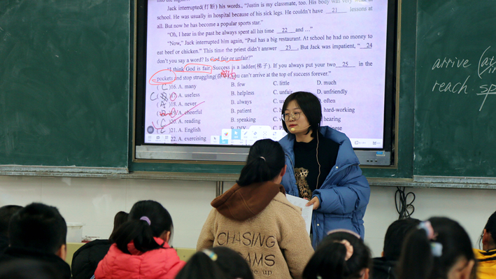 学校吴宏银老师以智学网大数据为支撑,深度融合信息化教学,全新的试卷讲评课充满了科技的力量,让人耳目一新。后台优等生的推荐,试卷重难点的凸显,小组加星的激励机制,随机抽取学生发言,试卷横向比较等等一系列的操作都显示出信息化教学的强大。吴老师娴熟的信息技术操控能力和较强的课堂驾驭能力展现出新时期英语教师的优秀素养。