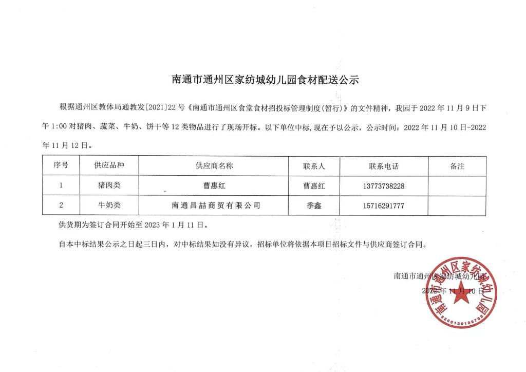 南通市通州区家纺城幼儿园食材配送公示