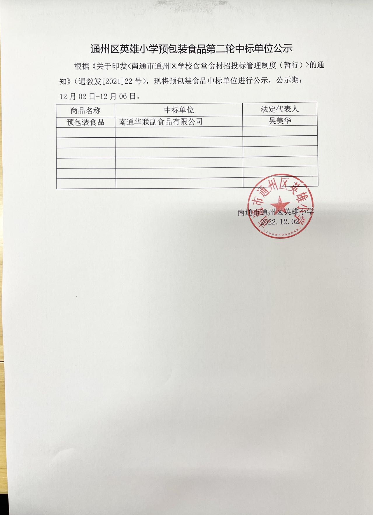 通州区英雄小学食堂预包装食品(第二轮)中标公告