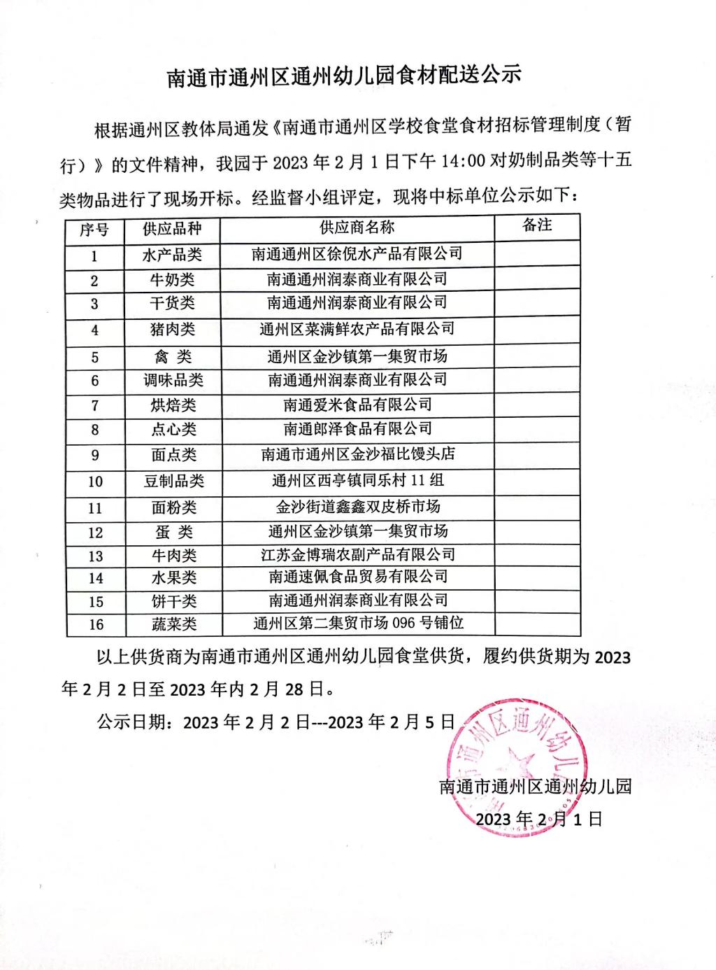 通州幼儿园食材配送公示
