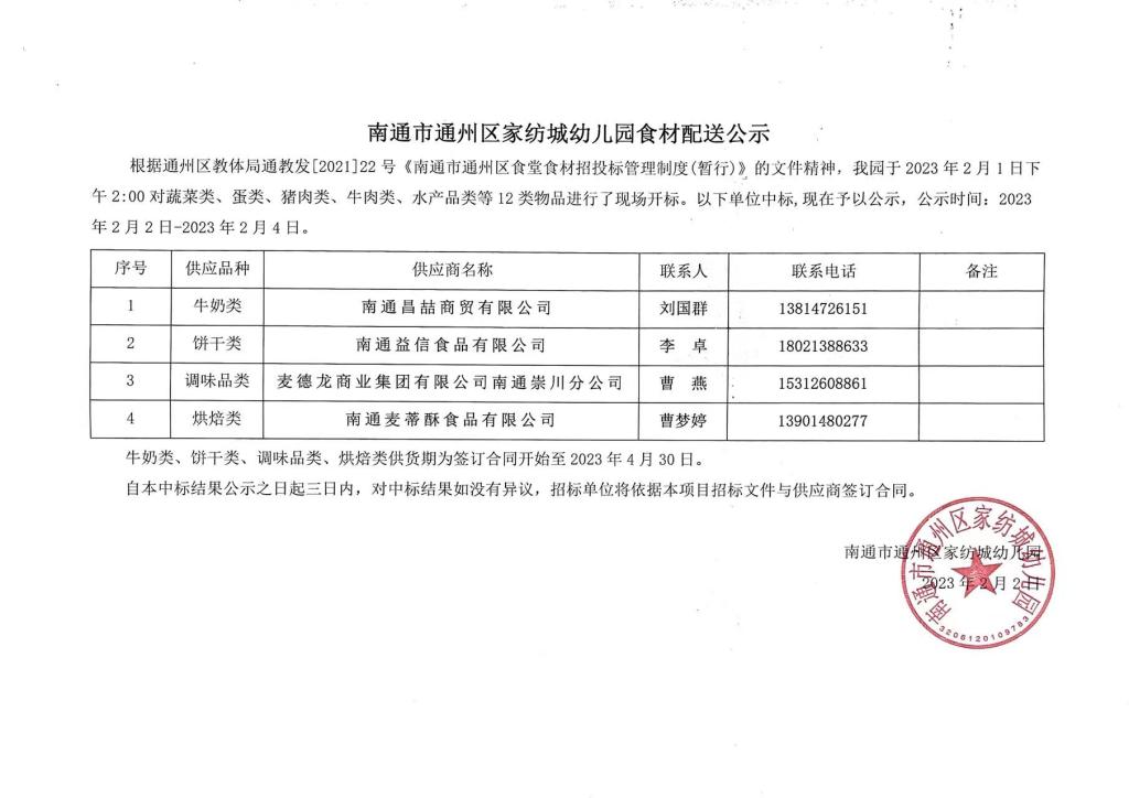 南通市通州区家纺城幼儿园食堂食材配送中标公示