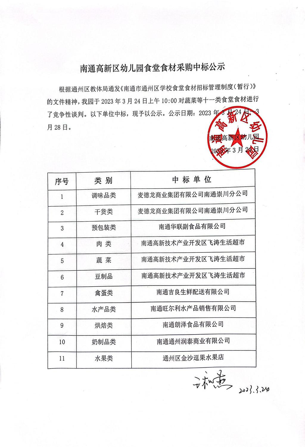 南通高新区幼儿园食堂食材中标公示