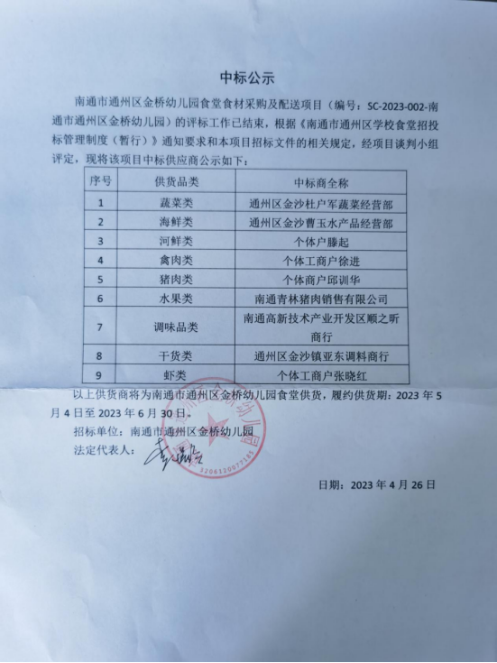南通市通州区金桥幼儿园食堂食材采购(第一轮)中标公告