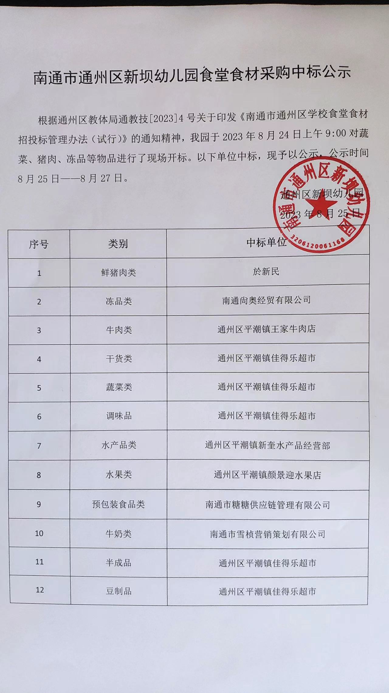 南通市通州区新坝幼儿园食堂食材采购及配送项目成交结果公告