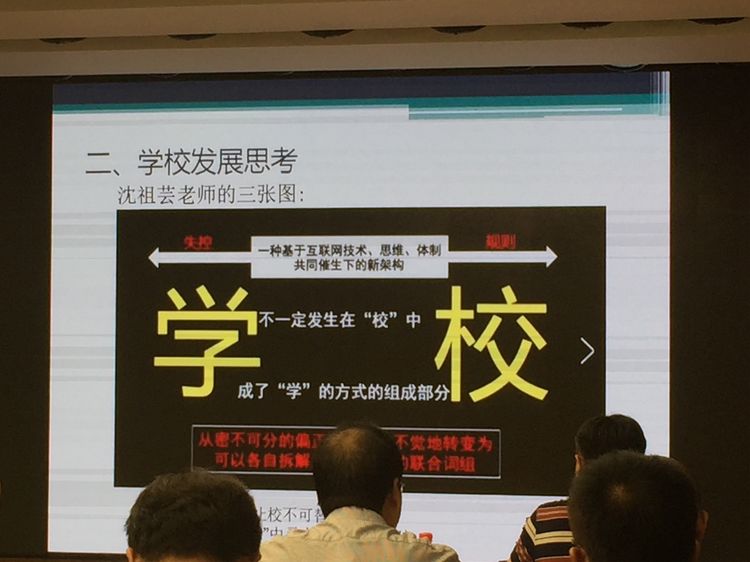 第二部分是学校发展思考,沈校长提出"新基础教育"的理念:改革创造"学校教育新生活",三底(底线、底蕴、底色),三力(内动力、内定力、内生力),三思(双向关联思维、整体融通思维、综合融通思维)。学校是一种基于互联网技术、思维、体制共同催生下的新架构,"学"不一定发生在"校"中,"校"成了"学"的方式的组成部分,让学无处不在,让校不可替代。沈校长还将正在重塑的新价值体系与传统的价值体系作了对比,学校要进行教的创新(改进课堂教学现状)、学的创新(改变学生的思维方式)、评价创新(改善目标迷茫现象),突破口是课程、课堂、管理。