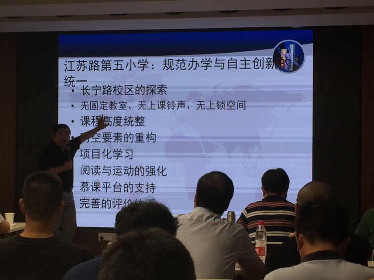 下午的讲座由平潮实验初中的孙振建校长主持,孙校长以"三个面向"(教育要面向现代化,面向世界,面向未来),高度赞扬了上海基础教育改革的前瞻性、国际化趋势。