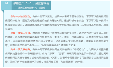 工作室领衔人任卫兵老师为自己制订的“参与一次培训活动”“寻找一种第二身份”“完成一项支教任务”的三个“一”行动计划,提醒教师及时地吸纳反思,不断地厚植情怀,主动地辐射引领,将促进教师更好地、更全面地发展。
