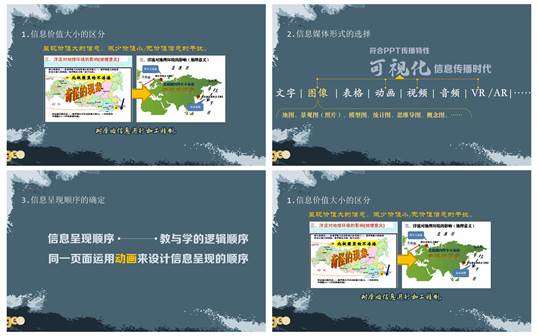 如何用PPT更有效地传递信息,让PPT的语言更友好。张老师从“信息价值大小的区分”、“信息媒体形式的选择”、“信息呈现顺序的确定”三个方面作了阐述。一张PPT页面,制作者必须清楚地认识到,需要呈现什么以及如何呈现。他举出大量的实例,说明如何让PPT页面呈现价值大的信息,减少价值小的信息的干扰;面对文字、图象、表格、动画、视频、音频、VR、AR等多种媒体,我们要尽可能的选择可视化的内容,这既是信息传播时代的特点,也符合PPT传播的特性,对于PPT中大量的文字处理,要遵循“结构化思考,视觉化呈现”的原则;PPT课件中信息的呈现顺序,反映出的是教与学的逻辑关系,教师在制作时,要理清知识结构,明确学生的思考过程,方能有效呈现。