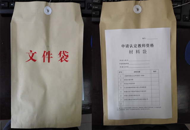 请将材料袋封面下载打印后贴在纸质材料袋封面(样式如上),其中编号由认定机构现场编排;申请人姓名、资格种类(初级中学教师资格、小学教师资格、幼儿园教师资格)和单位(此项如没有就不填)由申请人自行填写。