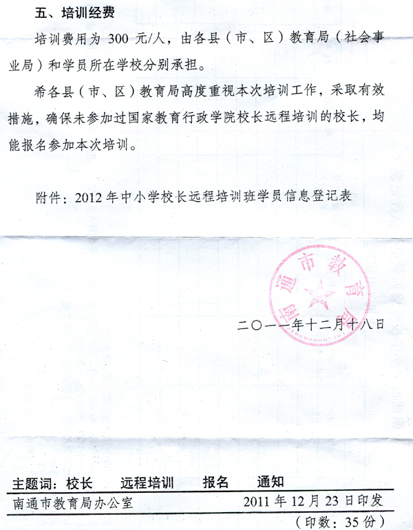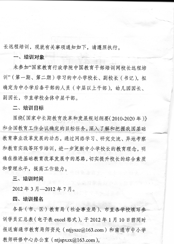 现将南通市教育局《关于做好“第三期校长远程培训”报名组织工作的通知》转发给你们,请各校根据文件要求同时结合《2012年南通市第三期中小学校长远程培训学员信息登记表》(附件2)核对参训人员名单,如果有新增的人员,请于2012年1月6日前将学员信息登记表(附件3)发至邮箱:tzjyjrsk@163.com,联系电话:86512465。
