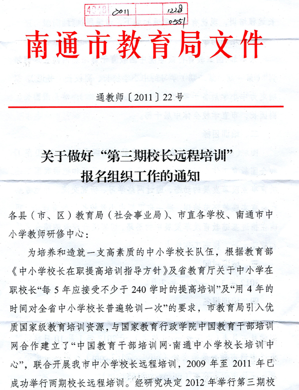 关于做好南通市第三期中小学校长远程培训有关工作的通知