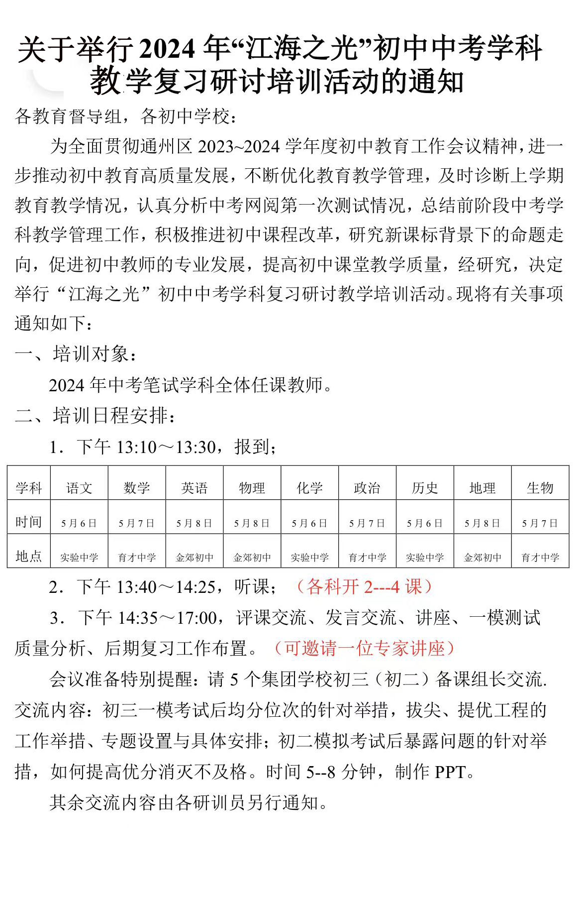 关于举行年“江海之光”初中中考学科教学复习研讨会培训活动的通知