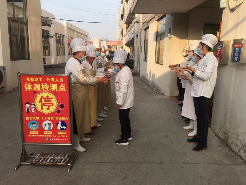 学校食堂作为师生就膳的场所,始终绷紧疫情防控这根弦,每天早晨上班都要进行体温检测及消杀,严格把控进货源头,对供应商提高的菜品进行严格把关,在加工的各个环节进行严格监督。