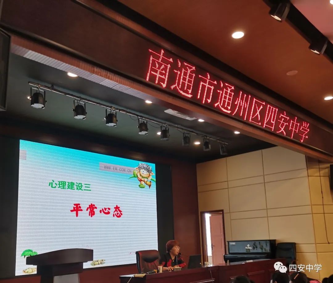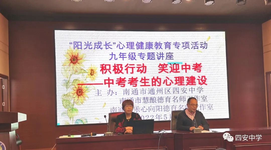 为迎接中考的到来,缓解初三学子的压力和焦虑心理,5月17日下午,南通市通州区四安中学、南通市慧酿德育名师工作室、南通市乐心向阳德育名师工作室联合举办了面对四安中学九年级全体学生的心理健康教育专题讲座,讲座由四安中学副校长、南通市慧酿德育名师工作室领衔人吴春园主持。