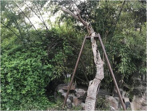 蕊春园内菊径旁也有一棵紫薇树,历史悠久,树干蛀空,千疮百孔。然而一到春季,仍竭尽全力冒出新芽,长出新叶,绽放花朵。