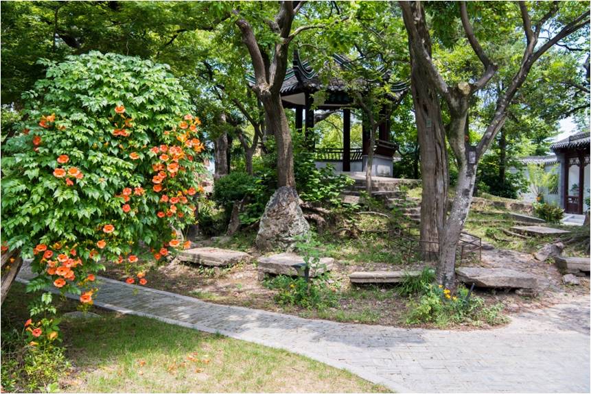 晚香阁与延月亭中间的小道旁,有一株极不起眼的植物,用木杆支撑着,侧着身子倚道而立,这就是凌霄。春日,当蕊春园里欣欣向荣之时,它却依然还在沉睡,枝干表皮脱落,呈枯褐色,让人觉得它已经没有了生命。7月的一天,你若从延月亭拾级而下,漫步大道时,你会惊喜地发现这里成了“灯笼”的世界,一朵朵凌霄花亲密无间地挤在一起,一片橙黄。柔弱的枝干竟变得热情无比,满载着熙熙攘攘的花开放了,把夏日的蕊春园照得明艳无比。9月的秋风,催促它再次回归平静,蓄积能量,期待来年花开。