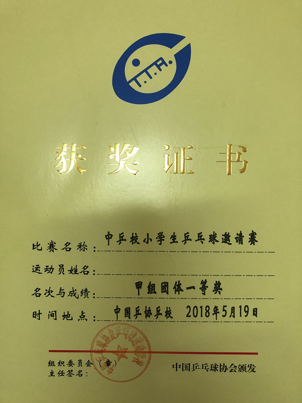 中乒小小学生乒乓球邀请赛甲组团体一等奖