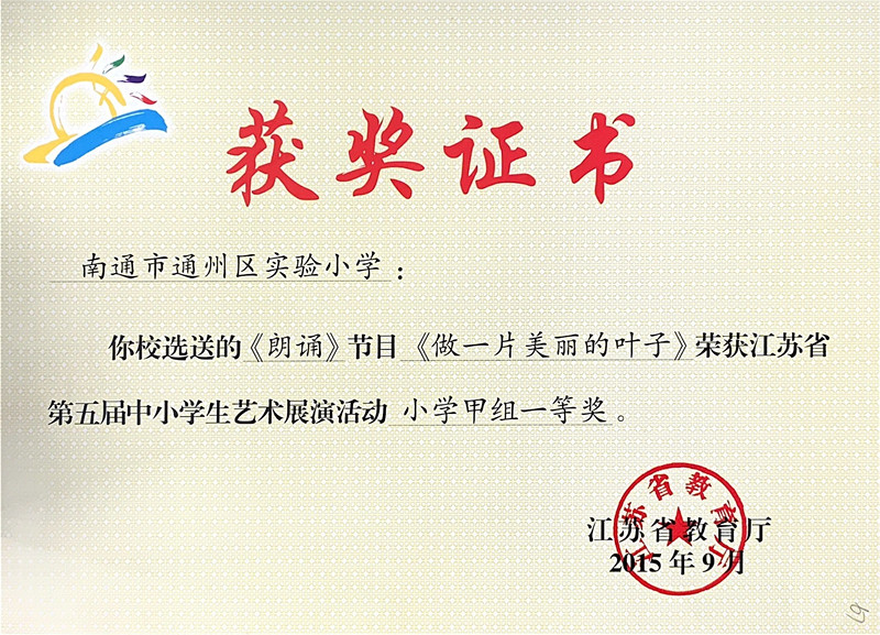 江苏省第五届中小学生艺术展演活动一等奖