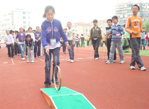 (7)教学“跳环法”: 在匀速行进中,用推手切入环的下口处,用力地往上挑,使铁环瞬息件间弹跳起来,在环落地后,以推手调控环的方向,摆正环的平衡点,再次向前推行,准备下一次的跳跃。