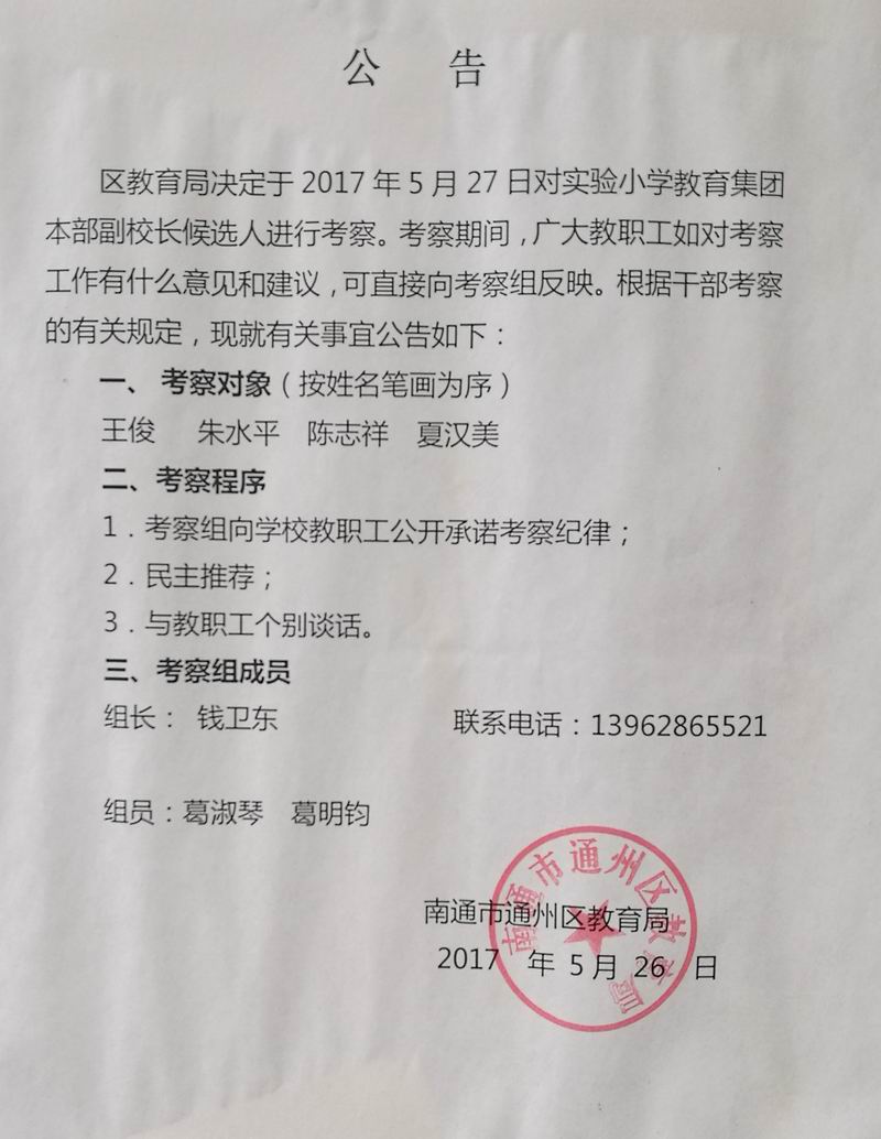 区教育局对通州实小教育集团本部副校长候选人进行考察的公告(5月26日)