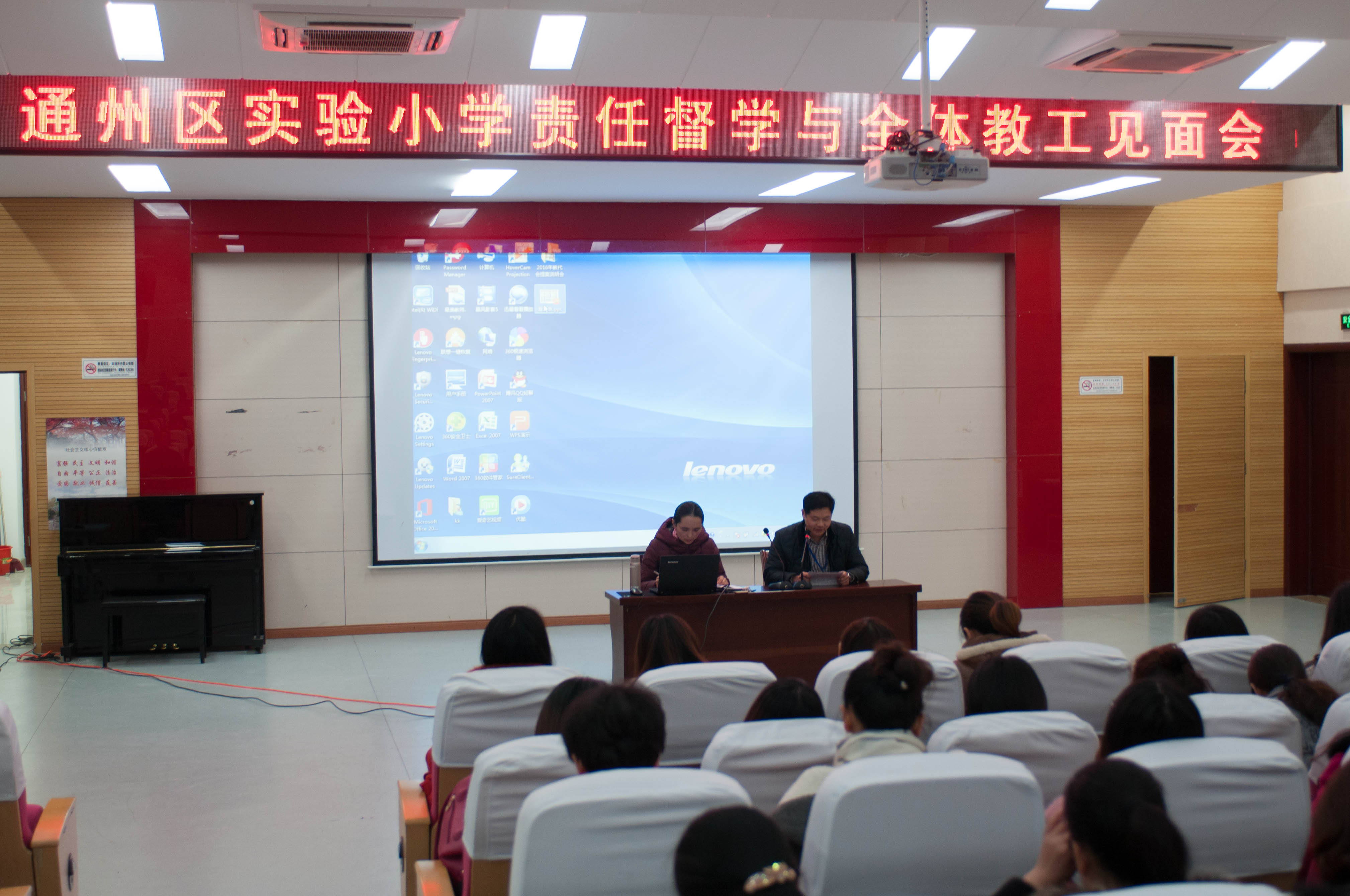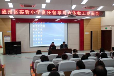 实验小学本部校区责任督学与全体教职工见面会,学校副校长蒋晓飞主持,王铭锋代表责任督学宣读督导工作内容和要求
