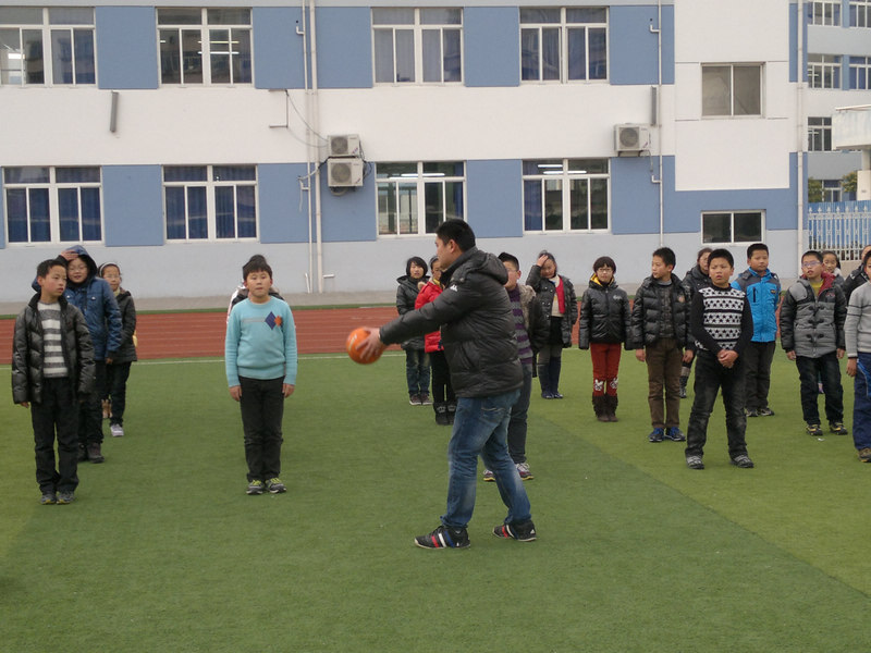 3.两人一组垫固定球游戏:两人面对面站立间隔1.5——2米的位置,一人双手持球(左右摆动),另一人判断球的方向用跨步方法去垫固定球,然后相互交换,让学生体验跨步垫球的动作方法。