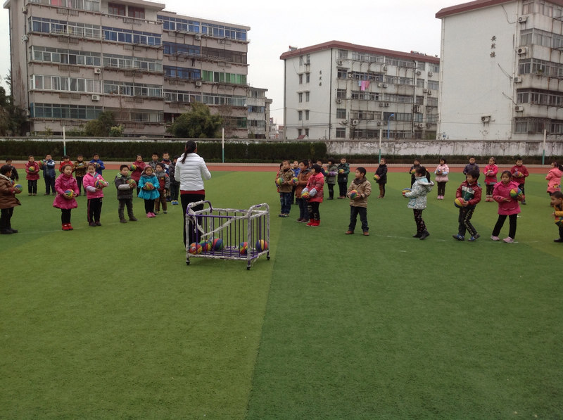 2、观察同伴的动作集体尝试练习原地拍球动作;