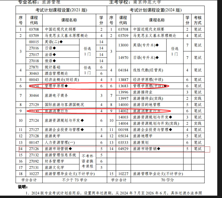考生在新计划中选择英语换考课程时,尽量选择名称差别较大的课程。例如:“27126 旅游市场营销”和“04929 旅游市场营销”,虽然代码不相同,但名称相同,所以算同一门课程,即不可选择作为英语换考课程。还有一些名称非常相似的课程也不要选作英语换考课程(如下图所示),后期毕业时省考试院可能审核不通过。