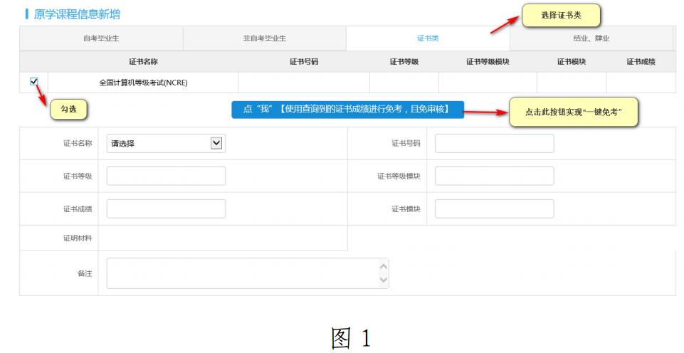 3.在江苏省参加全国计算机等级考试(NCRE)的考生使用合格证书用于申请免考的,须按以下流程进行“一键免考”:请直接选择证书类→勾选出现的信息(如未出现可勾选的信息,须自行核对NCRE证书信息中的身份证号码及姓名是否与本系统中的信息相符)→勾选后点击蓝色按钮(如图1)→直接得到免考审核结果。