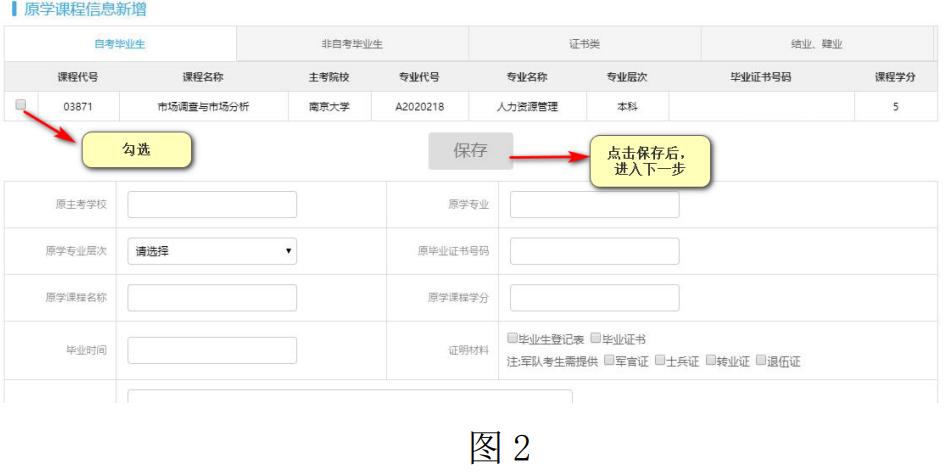 4.使用本人已毕业课程成绩用于申请免考的,可点击“江苏自考毕业生”,如出现可勾选课程用于免考申请的(如图2),须勾选后再点击保存,返回图3界面,点击免考申请修改,确认无误后点击“提交申请”。