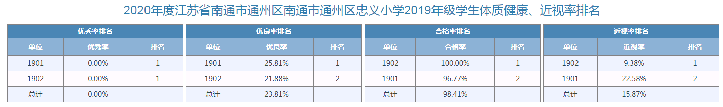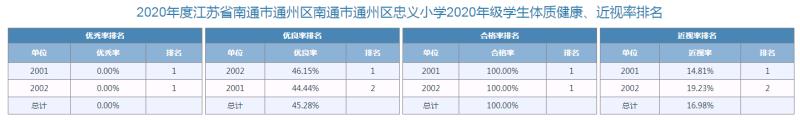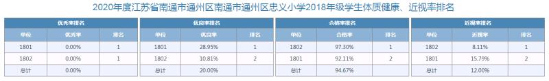 2020学年度通州区忠义小学学生体质健康、近视率排名